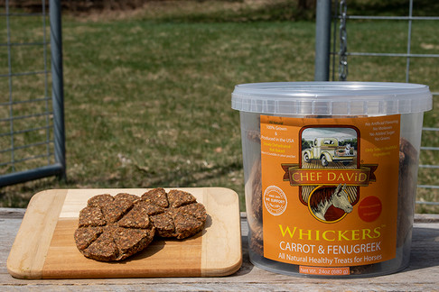 CHEF DAVID WHICKERS ARE MADE WITH THE SAME LOVE AND CARE THAT GO INTO ALL OF OUR PRODUCTS. 100% U.S.A. GROWN INGREDIENTS, MANY FROM OUR OWN GARDENS AND GREENHOUSES, CHOSEN TO PROMOTE THE OVERALL HEALTH AND WELLNESS OF YOUR HORSE. NO PRESERVATIVES, GRAIN - FREE, MOLASSES - FREE, AND NOTHING ARTIFICIAL - JUST PURE, WHOLESOME, HEALTHY INGREDIENTS!